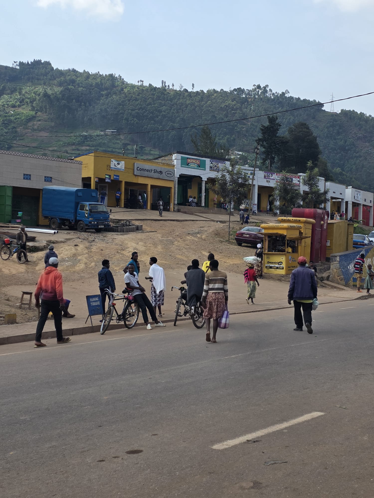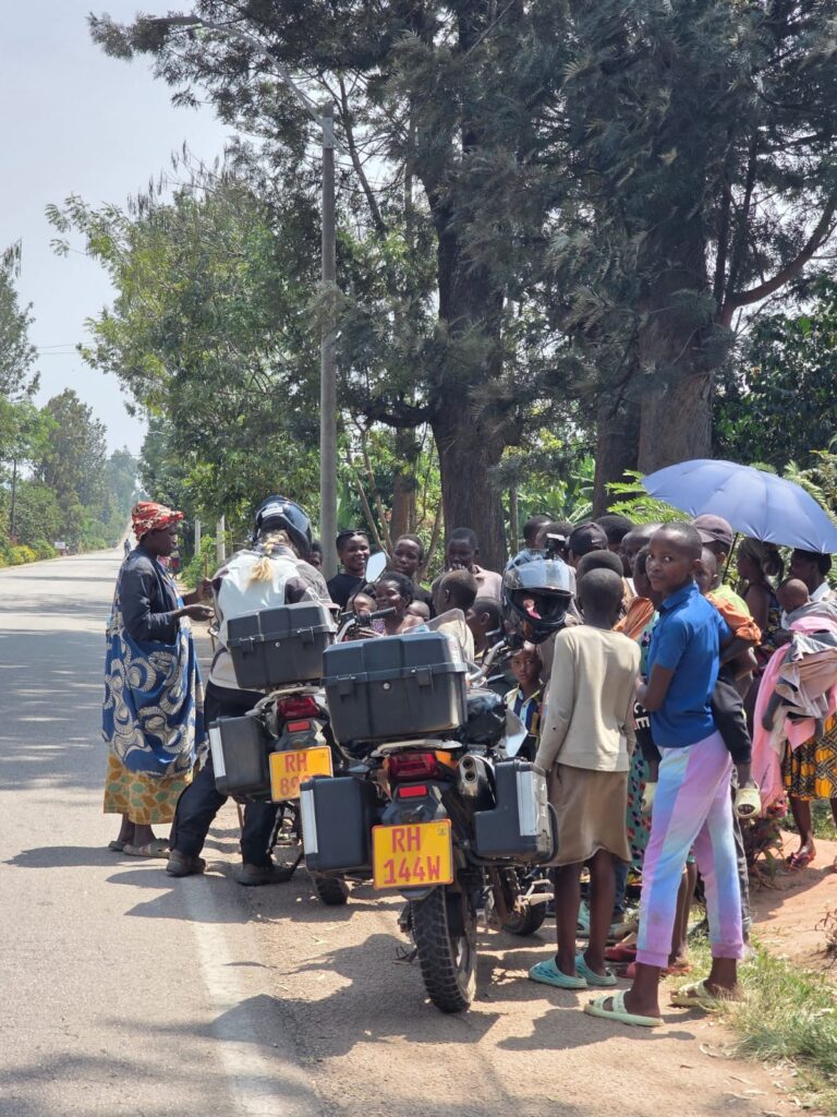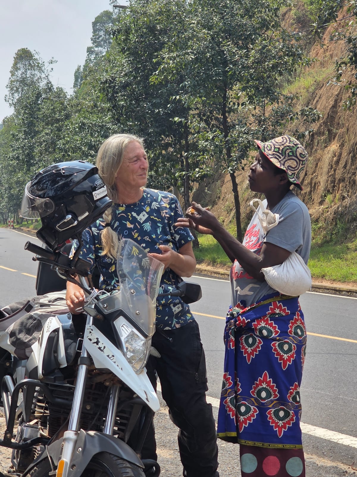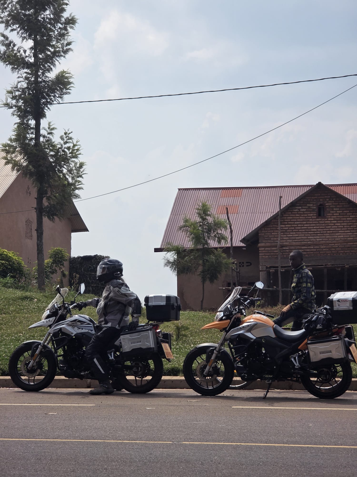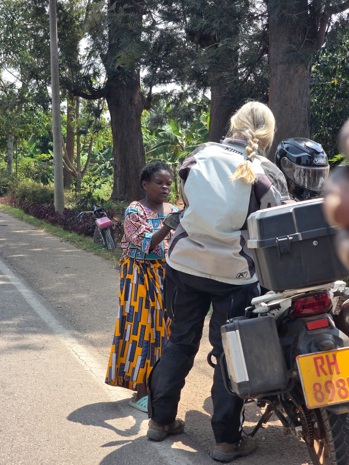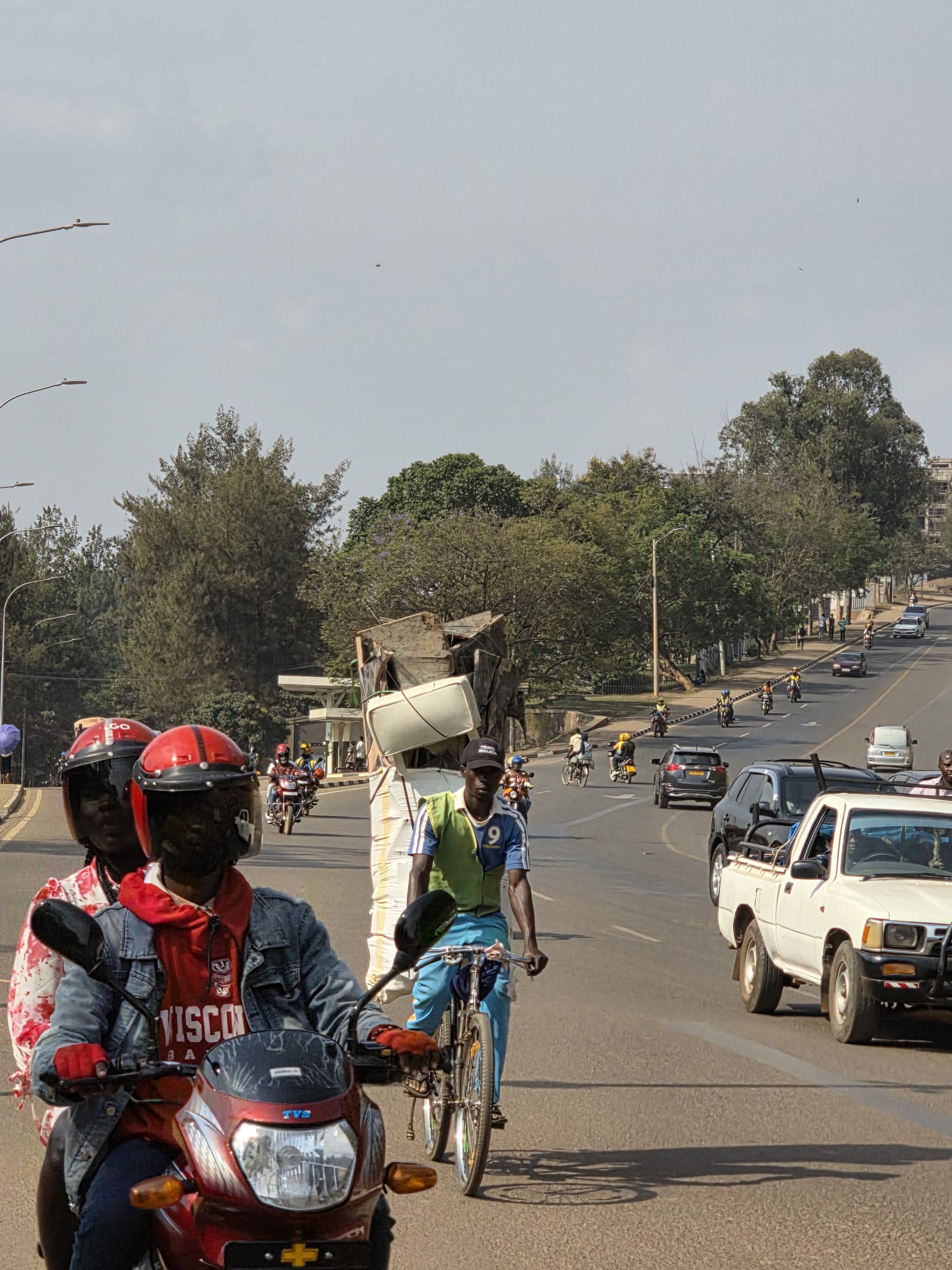 ברואנדה אסור שימוש בשקיות ניילון (איכות סביבה), אך יש שימוש מצוין לנילון שכן מסתובב פה- כדורגל איכותי! ממשיכים בדרך. כשמתקרבים לעיר הגדולה התנועה נעשית צפופה יותר, וכל משאית גורמת לפקק תנועה. אוטובוס שעולה באש סוגר את הכביש- אנחנו בעקבות האופנועים המקומיים מצמצמים ועוברים לראש הפקק, יוצאים עם הנחיל ומשאירים את המכוניות מאחור. הכבישים צרים- יש 2 נתיבים, ושוליים שמאפשרים תנועה להולכי רגל ואופניים, כשמכונית נתקעת- אין לאן להזיז, והכביש נשאר עם נתיב אחד. אף אחד לא מתעצבן/צועק/ מקלל- מקבלים הכל בשלווה. קצב אפריקה! עצירה לקפה במקום של עזיזי. זהו מרכז לאמנות מקומית שהוקם על ידי אמריקאי- רואים את זה בתצוגה המאורגנת ובשילוט שקורא לקנות, לתרום ולעזור למקומיים. השומרת בפתח רוצה לנקות לנו את האופנועים- אני מוותרת בחיוך- זה לא יעזור להם..