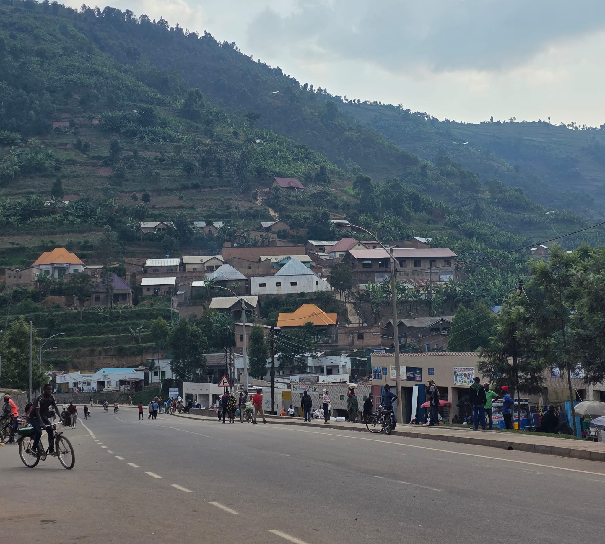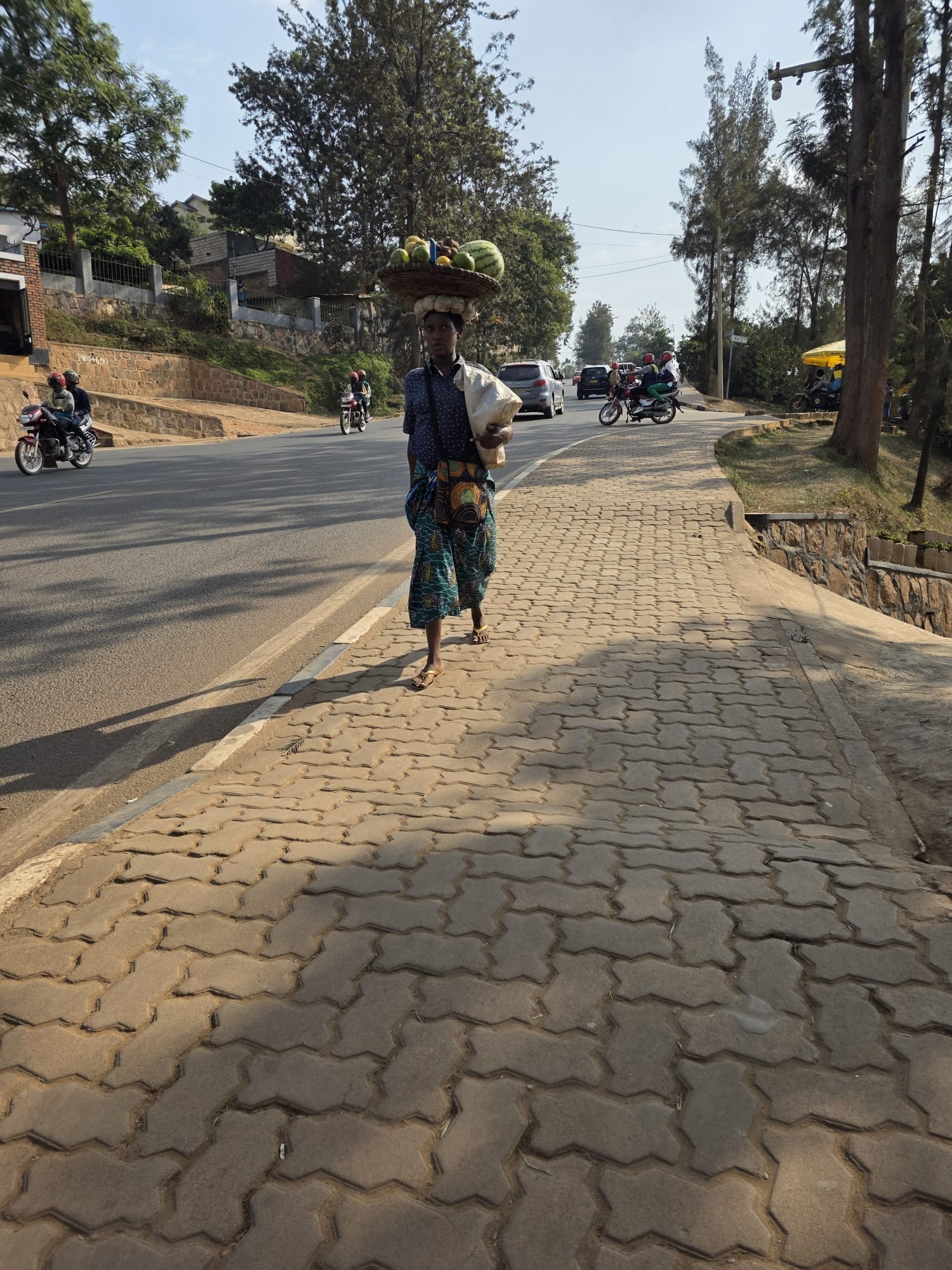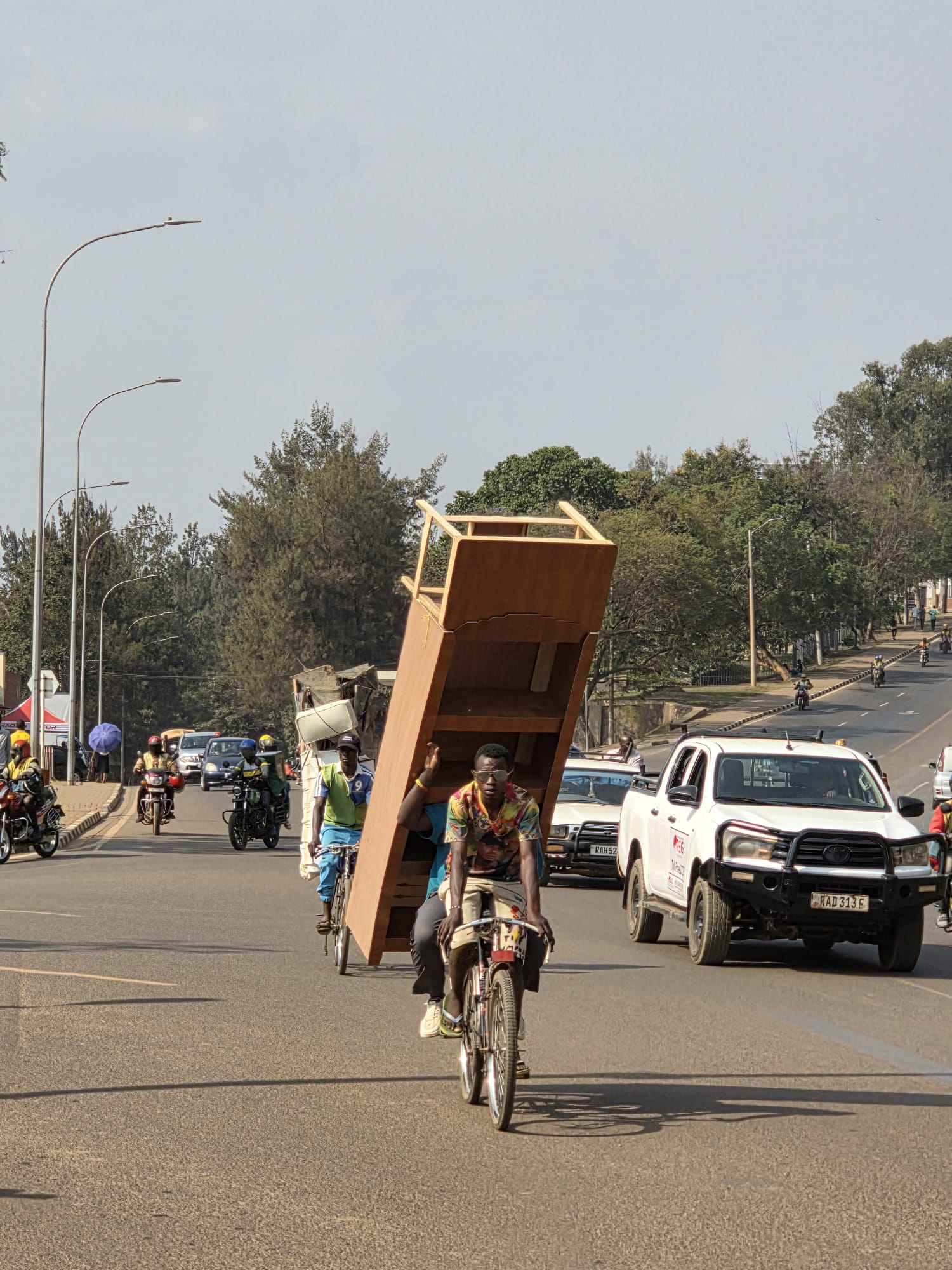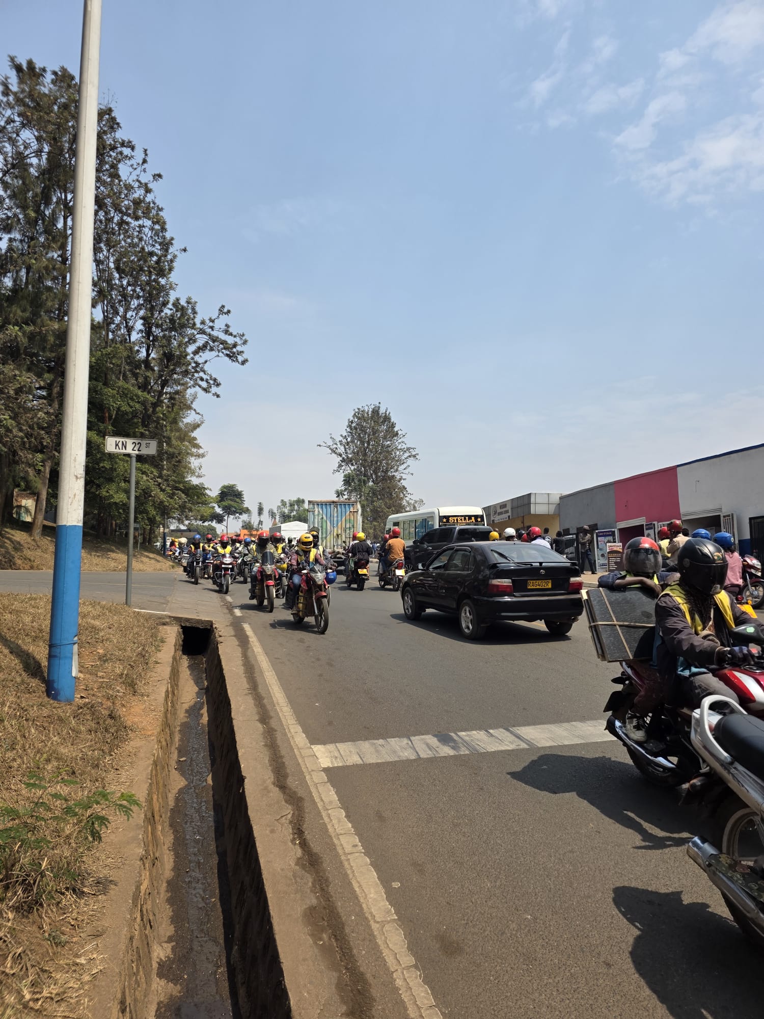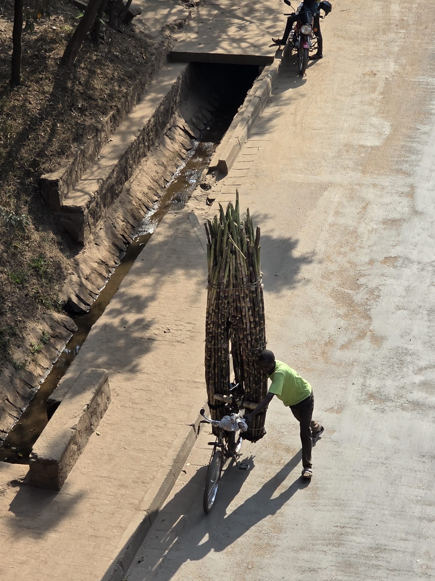ברואנדה אסור שימוש בשקיות ניילון (איכות סביבה), אך יש שימוש מצוין לנילון שכן מסתובב פה- כדורגל איכותי! ממשיכים בדרך. כשמתקרבים לעיר הגדולה התנועה נעשית צפופה יותר, וכל משאית גורמת לפקק תנועה. אוטובוס שעולה באש סוגר את הכביש- אנחנו בעקבות האופנועים המקומיים מצמצמים ועוברים לראש הפקק, יוצאים עם הנחיל ומשאירים את המכוניות מאחור. הכבישים צרים- יש 2 נתיבים, ושוליים שמאפשרים תנועה להולכי רגל ואופניים, כשמכונית נתקעת- אין לאן להזיז, והכביש נשאר עם נתיב אחד. אף אחד לא מתעצבן/צועק/ מקלל- מקבלים הכל בשלווה. קצב אפריקה! עצירה לקפה במקום של עזיזי. זהו מרכז לאמנות מקומית שהוקם על ידי אמריקאי- רואים את זה בתצוגה המאורגנת ובשילוט שקורא לקנות, לתרום ולעזור למקומיים. השומרת בפתח רוצה לנקות לנו את האופנועים- אני מוותרת בחיוך- זה לא יעזור להם..
