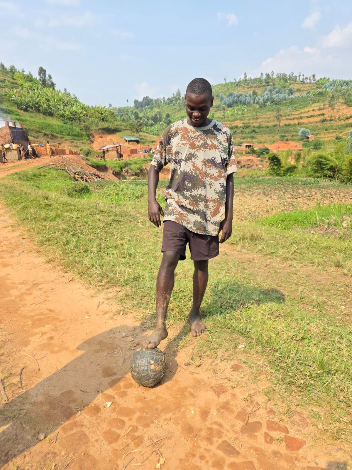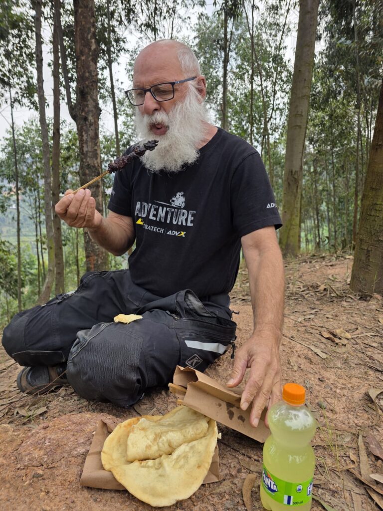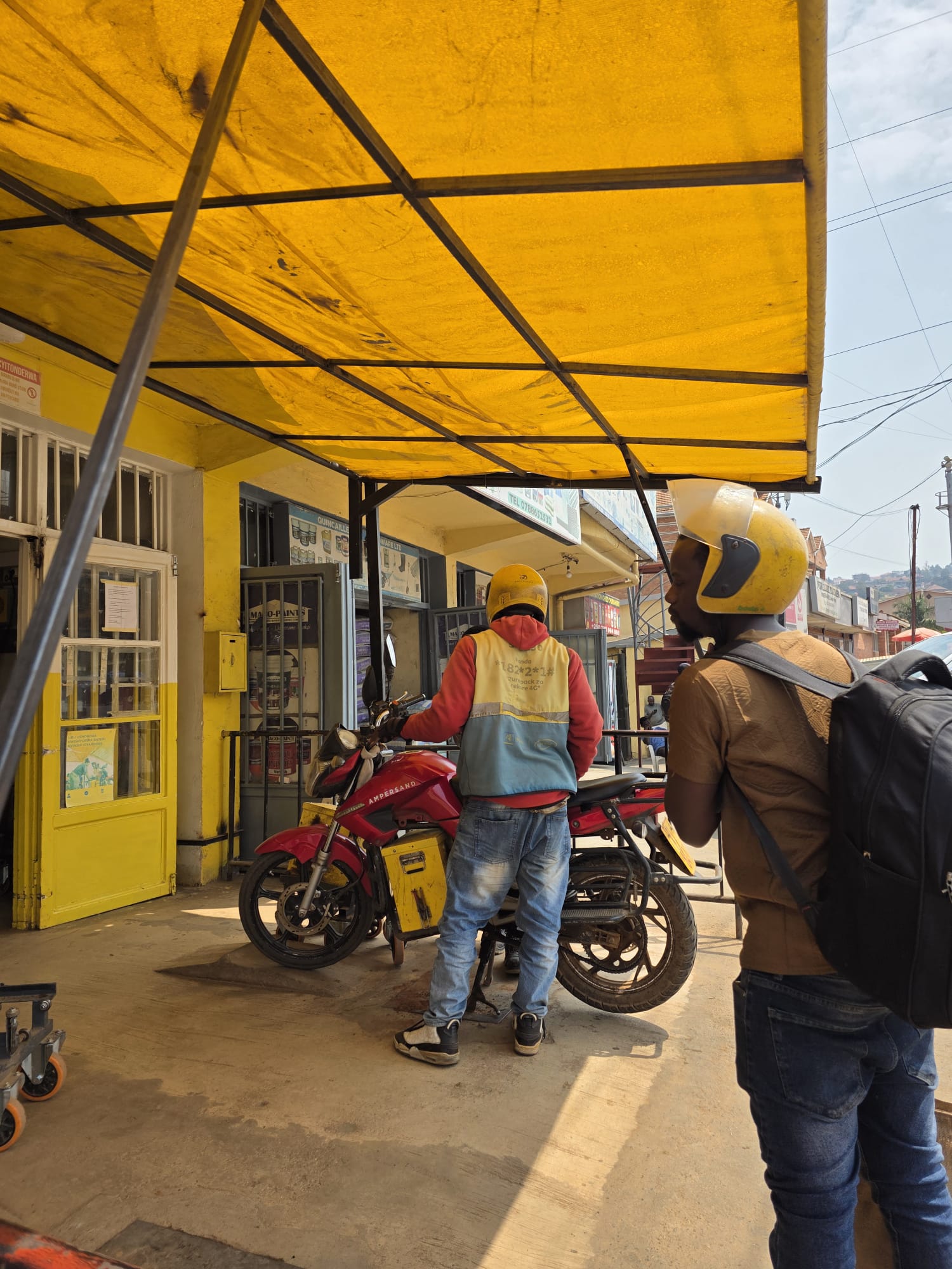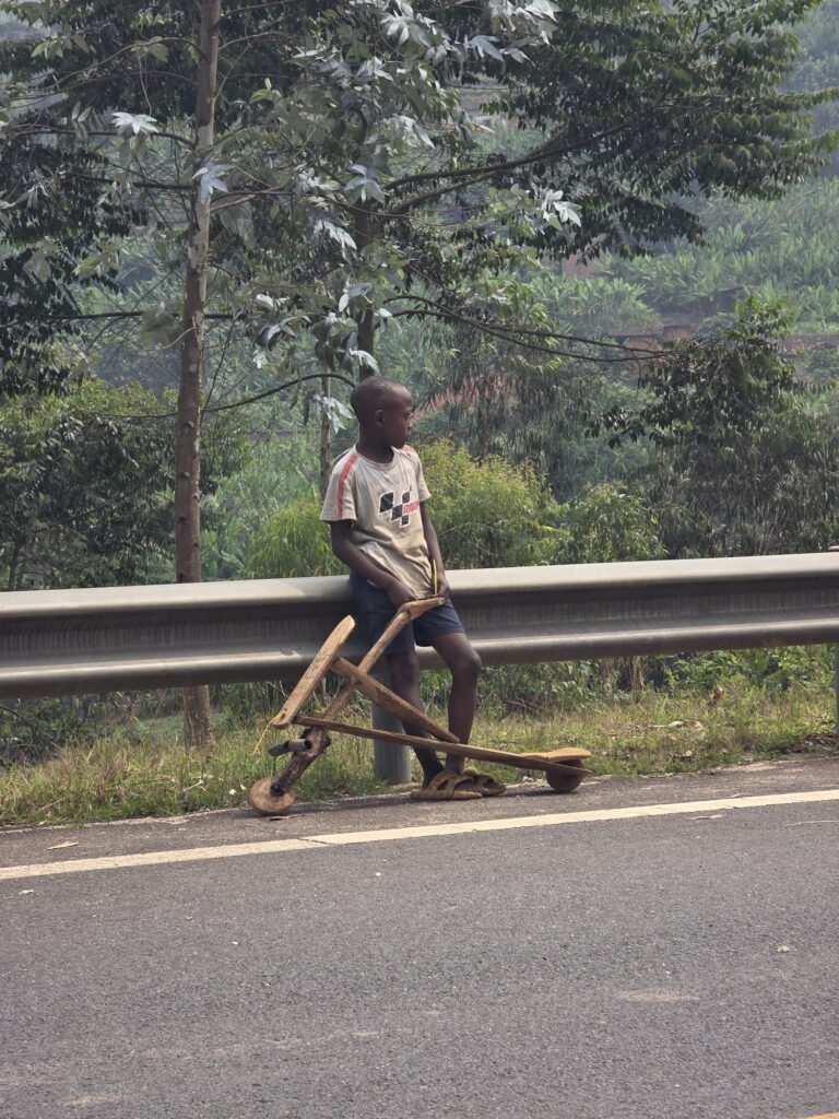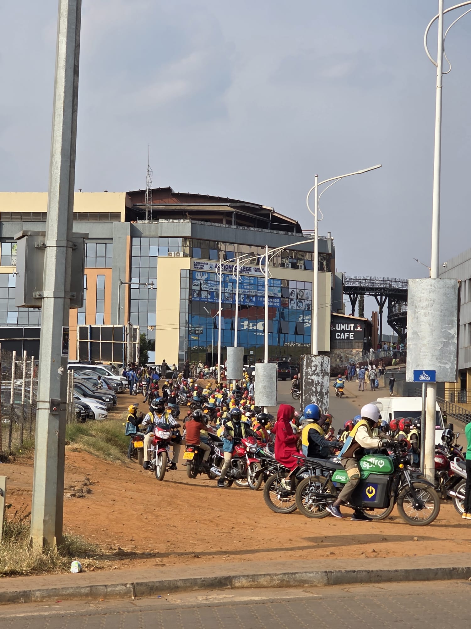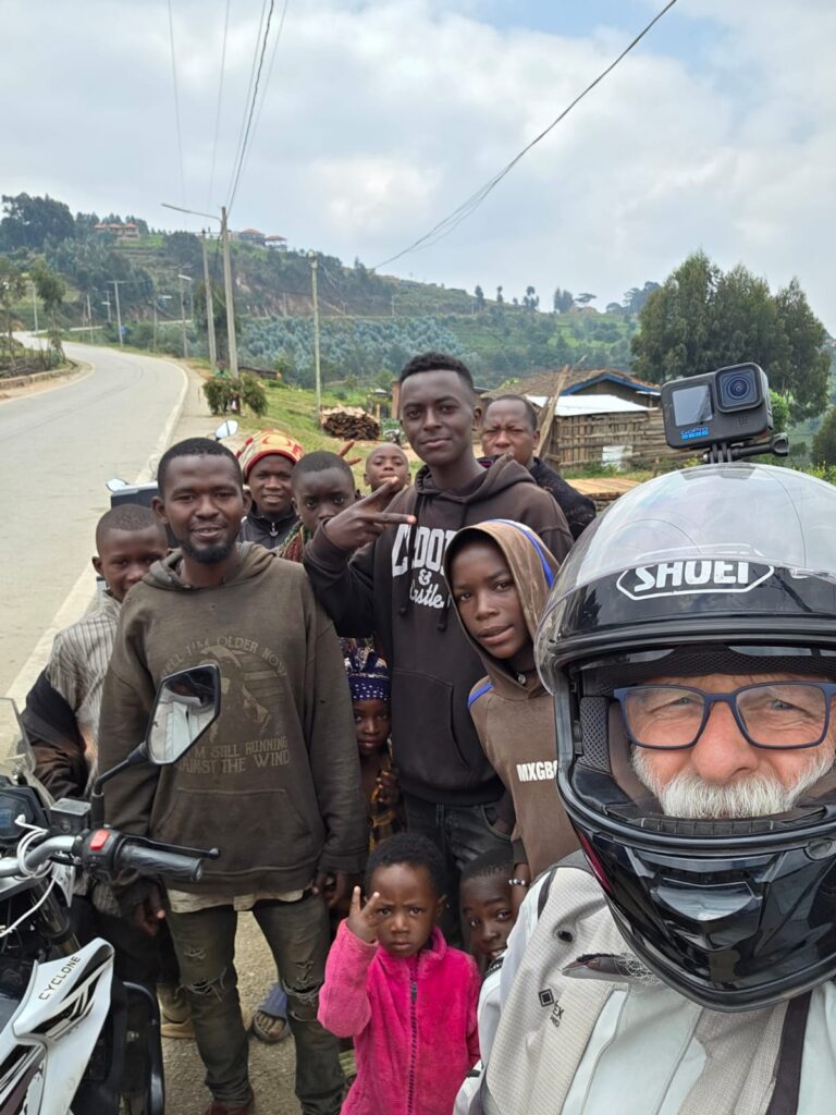 ברואנדה אסור שימוש בשקיות ניילון (איכות סביבה), אך יש שימוש מצוין לנילון שכן מסתובב פה- כדורגל איכותי! ממשיכים בדרך. כשמתקרבים לעיר הגדולה התנועה נעשית צפופה יותר, וכל משאית גורמת לפקק תנועה. אוטובוס שעולה באש סוגר את הכביש- אנחנו בעקבות האופנועים המקומיים מצמצמים ועוברים לראש הפקק, יוצאים עם הנחיל ומשאירים את המכוניות מאחור. הכבישים צרים- יש 2 נתיבים, ושוליים שמאפשרים תנועה להולכי רגל ואופניים, כשמכונית נתקעת- אין לאן להזיז, והכביש נשאר עם נתיב אחד. אף אחד לא מתעצבן/צועק/ מקלל- מקבלים הכל בשלווה. קצב אפריקה! עצירה לקפה במקום של עזיזי. זהו מרכז לאמנות מקומית שהוקם על ידי אמריקאי- רואים את זה בתצוגה המאורגנת ובשילוט שקורא לקנות, לתרום ולעזור למקומיים. השומרת בפתח רוצה לנקות לנו את האופנועים- אני מוותרת בחיוך- זה לא יעזור להם..