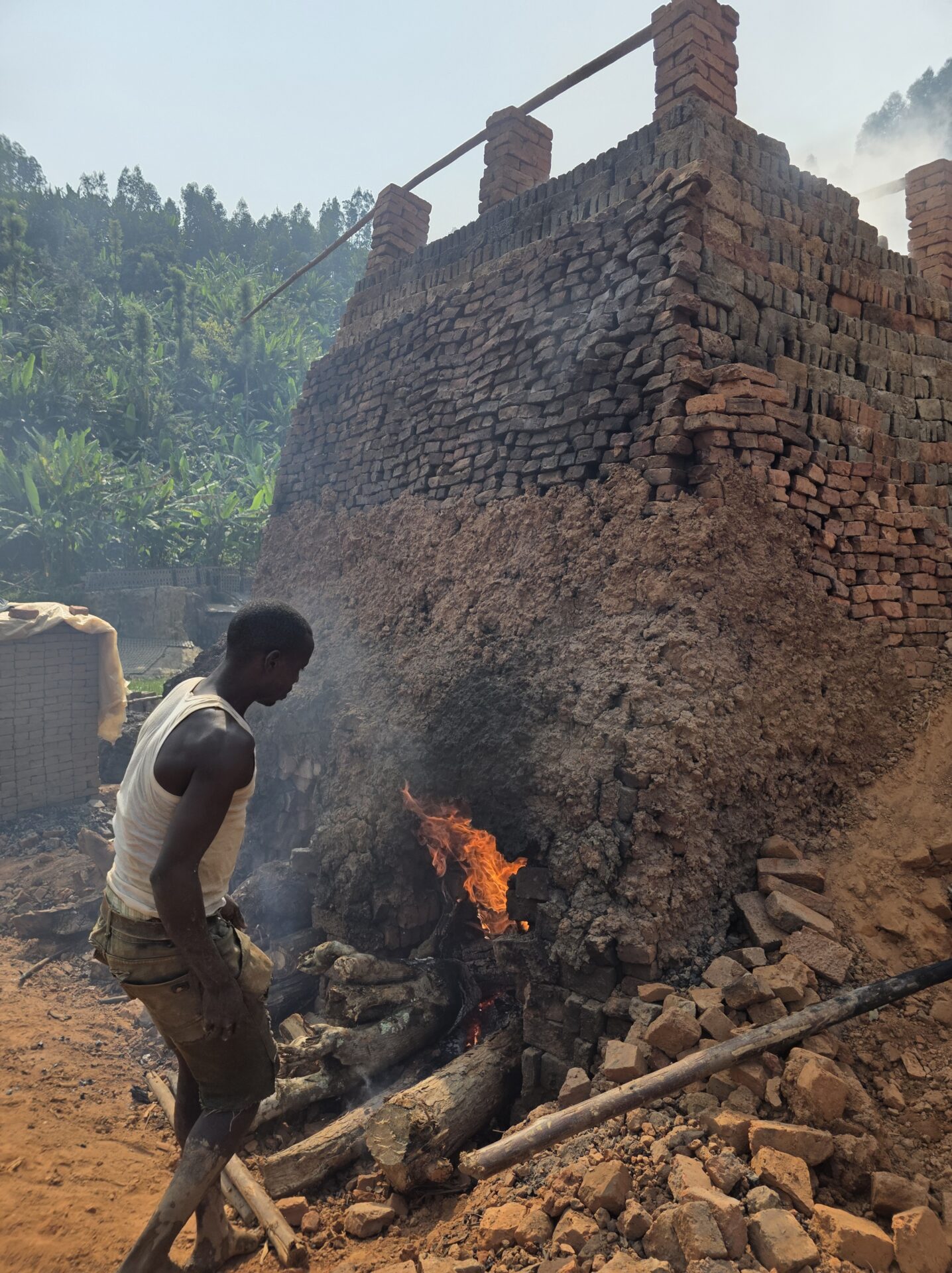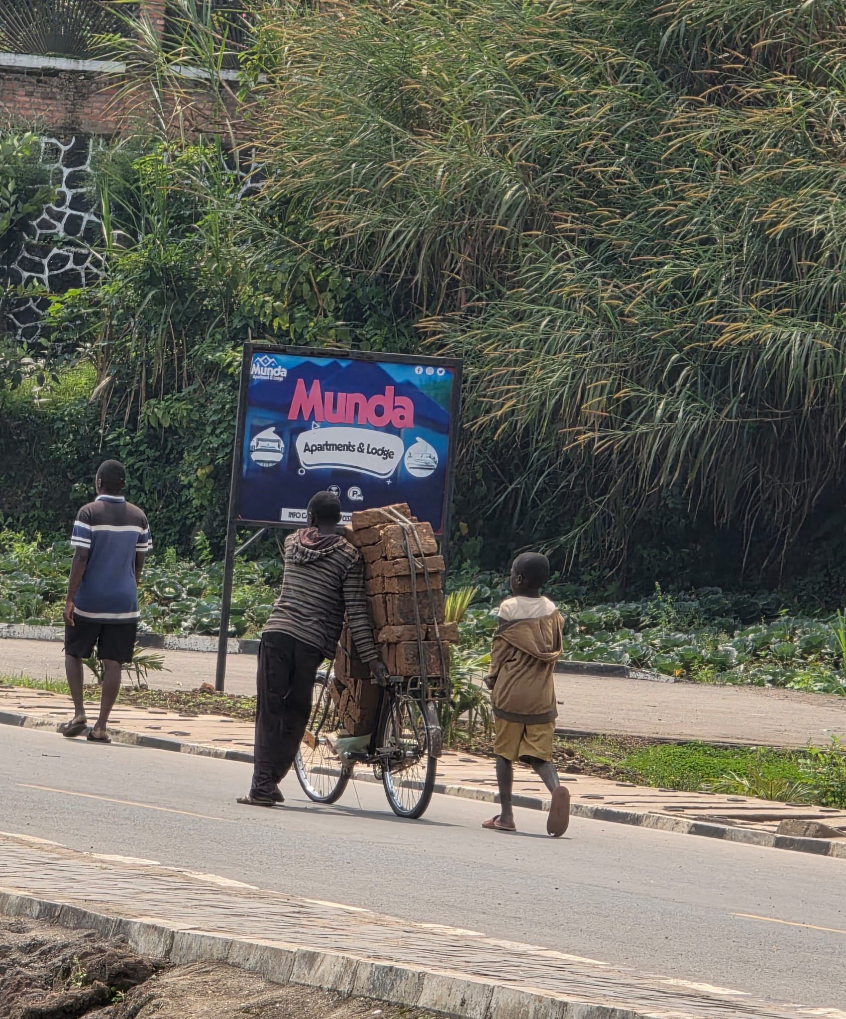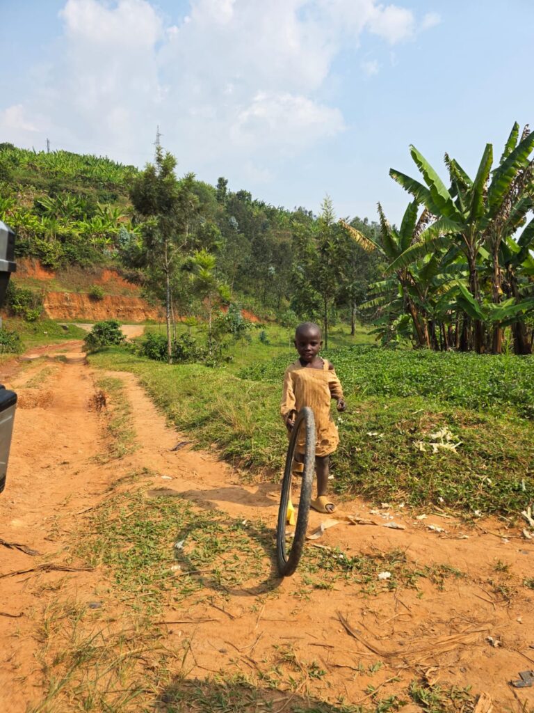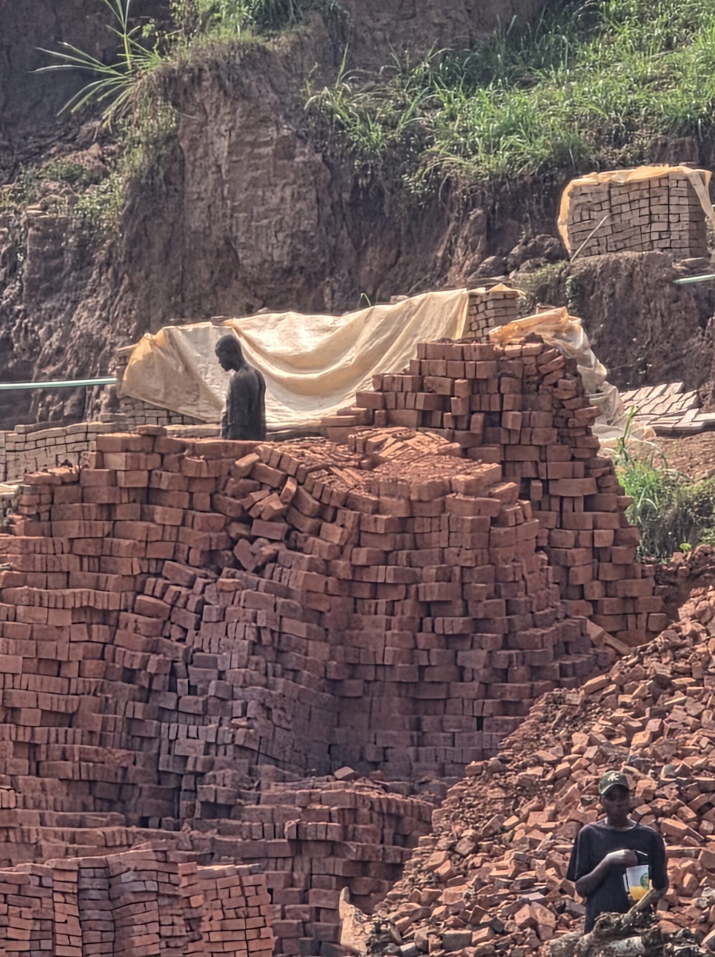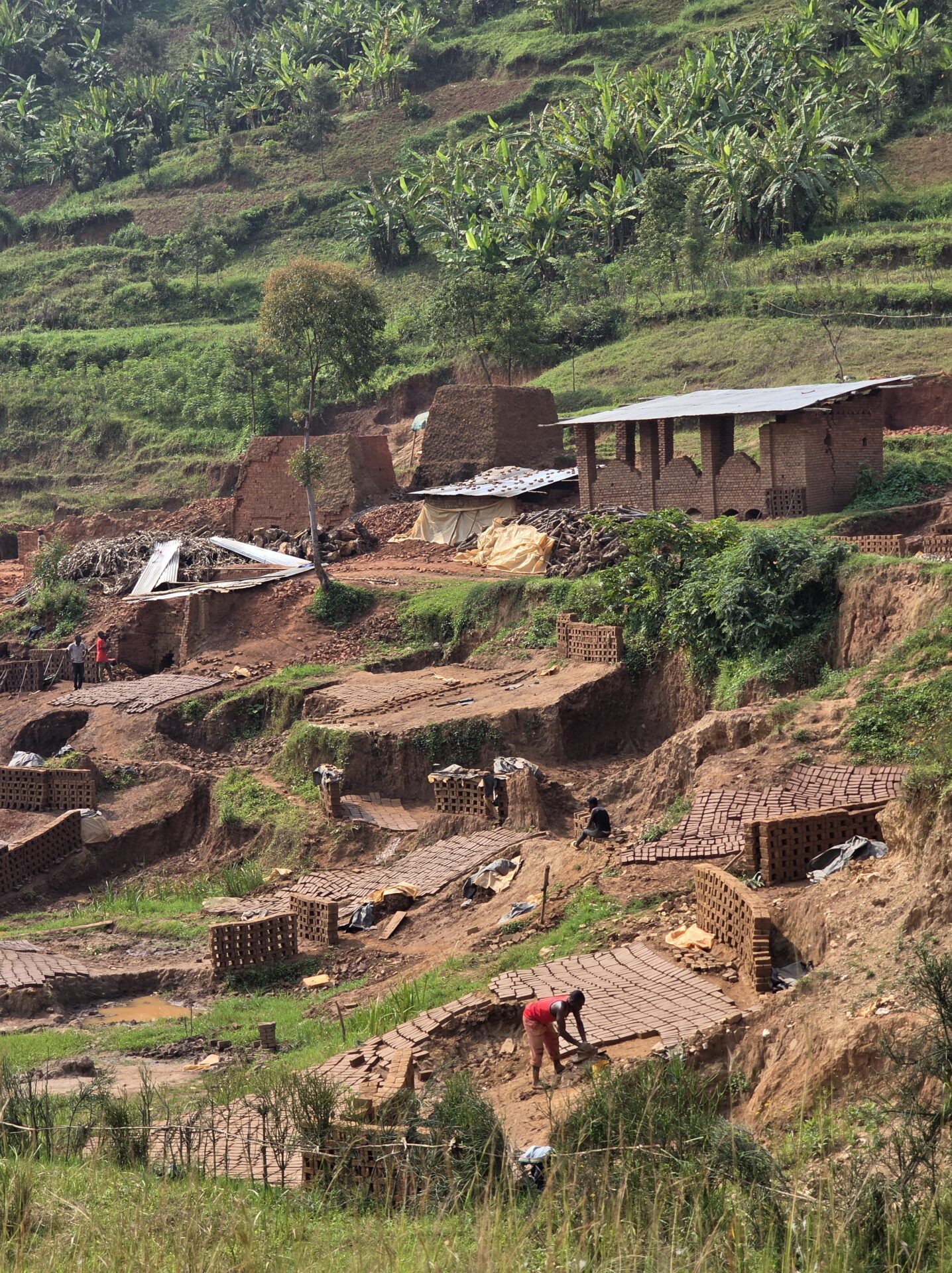 בוקר סגרירי- שוב- השמש יוצאת מהעננים מאוחר יותר, ומזג האויר תמיד נהדר לרכיבה וטיול. חשבנו להמשיך מכאן למקום של רון וייס על שפת אגם בוגסרה. המקום נראה מקסים בתמונות, אמנם דרך עפר של כמה קילומטרים, קטן עלינו… הזדמנות לנוח יומיים במקום שלו. בדיקה נוספת- אין ווי פי. לא נעמוד בזה. מוותרים בצער. הרכיבה כרגיל נעימה- כבישים טובים, מזג אויר נהדר, והתנועה איטית כמו שאני אוהבת! בצד הדרך קולטים 'מפעל לבנים'. גדי עוצר לצלם, כמובן שמיד מיהו עולה בריצה. גדי שואל אם אפשר להתקרב ולהכנס. בטח! יורדים מהכביש לדרך קטנה שמובילה למקום, איך שאנחנו מחנים את האופנועים כבר יש עשרה ילדים מסביבנו. הלבוש שלהם מרופט, אבל לא נראים מסכנים. שלשה קטנים מתקרבים עם גלגל ומוט- משחק מקובל שאצלנו נעלם מהנוף. גדי מבקש רשות לנסות. כולנו מתגלגלים מצחוק לראות את הכשלונות שלו.. אנחנו נכנסים לראות את העבודה- קודם חופרים ערימת בוץ, אחר כך יש את אלו שמכינים את הבלוקים בתבנית ומסדרים ליבוש. משם עוברים למגדל ענק של בלוקים, מסודר כמו פירמידה קטומה. למטה יש פתחים שלתוכם דוחפים שברי גזעים ומבעירים. האש דולקת כמה ימים, ומשאירים עוד כמה ימים להתקררות. פועל יכול לעשות כ 400-600 לבנים ביום. השכר של פועל פשוט- 2500 פרנק רואנדי ליום. זה פחות משני דולר. ומי שיש לו עבודה שמח מאד- באזורים החקלאיים לא תמיד יש. למרות שקצב העבודה שלהם יכול להוציא מהדעת את מי שבא מתרבות מערבית, הם עובדים קשה מאד.