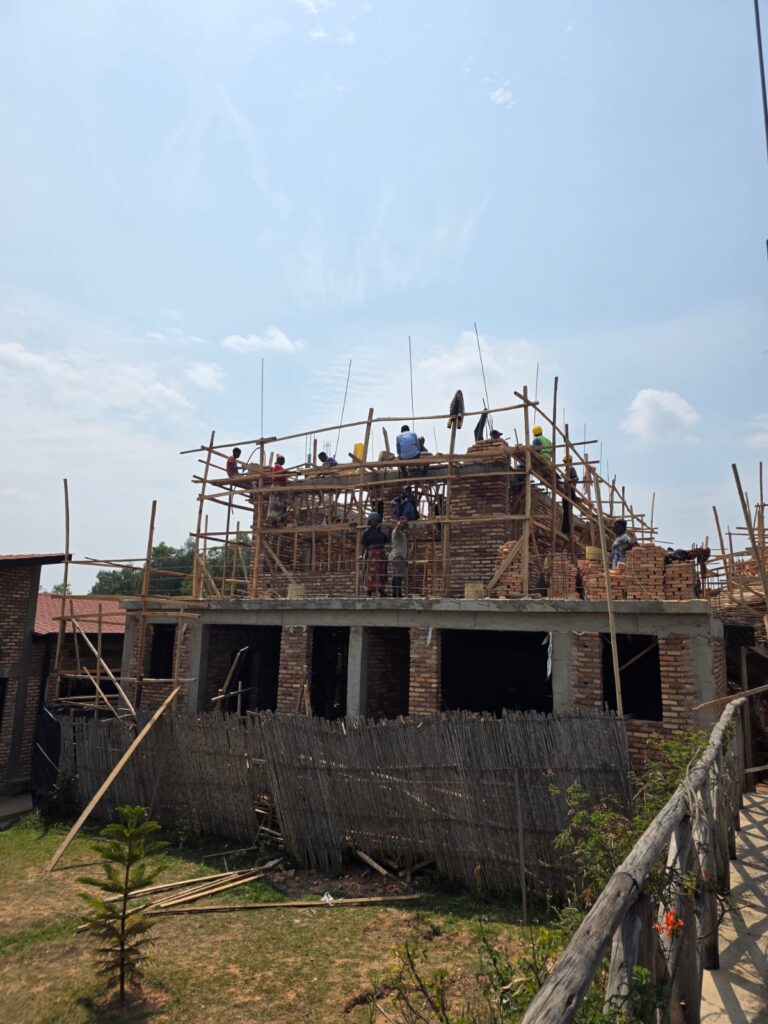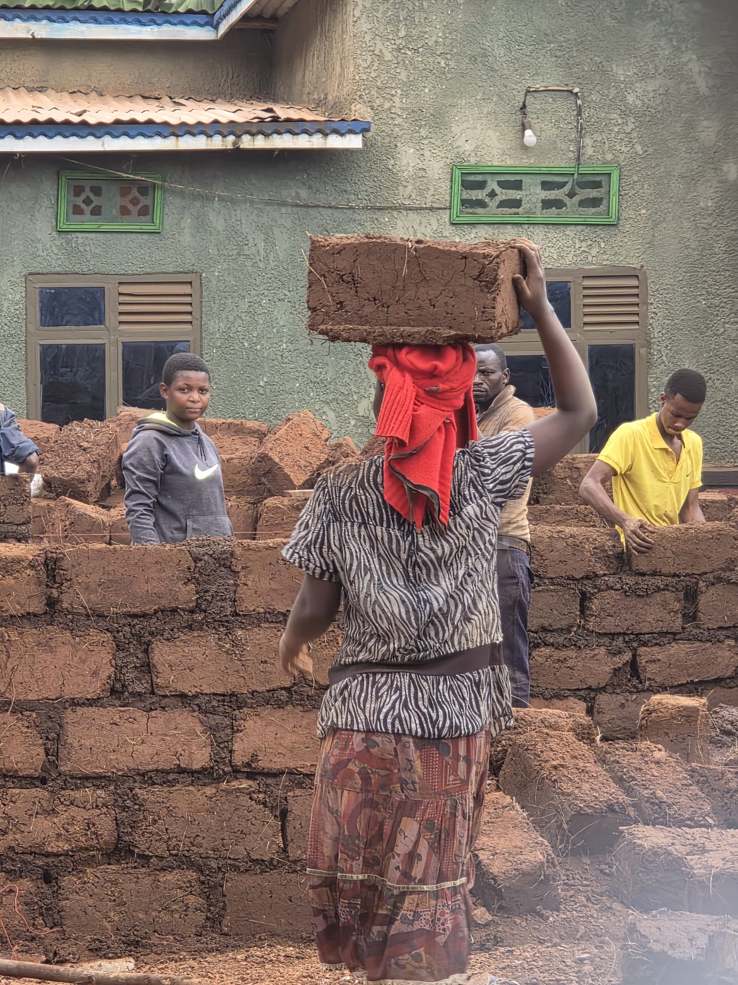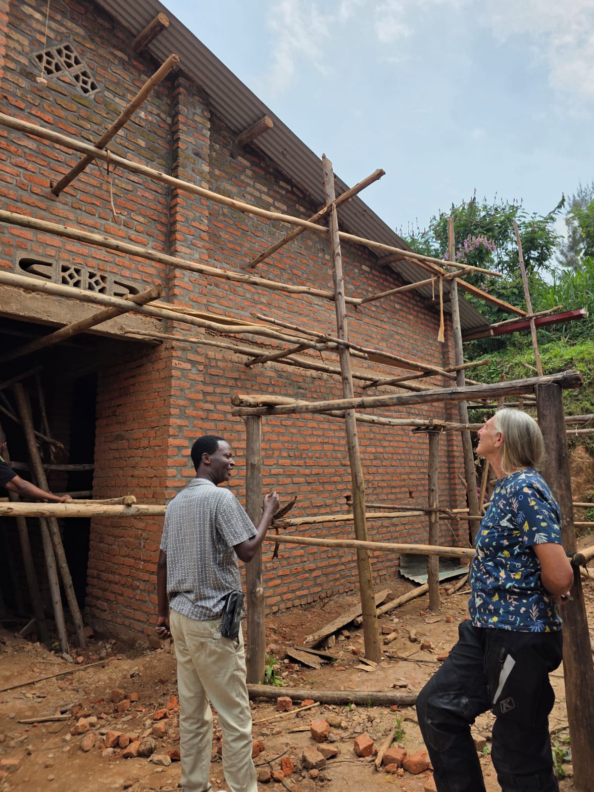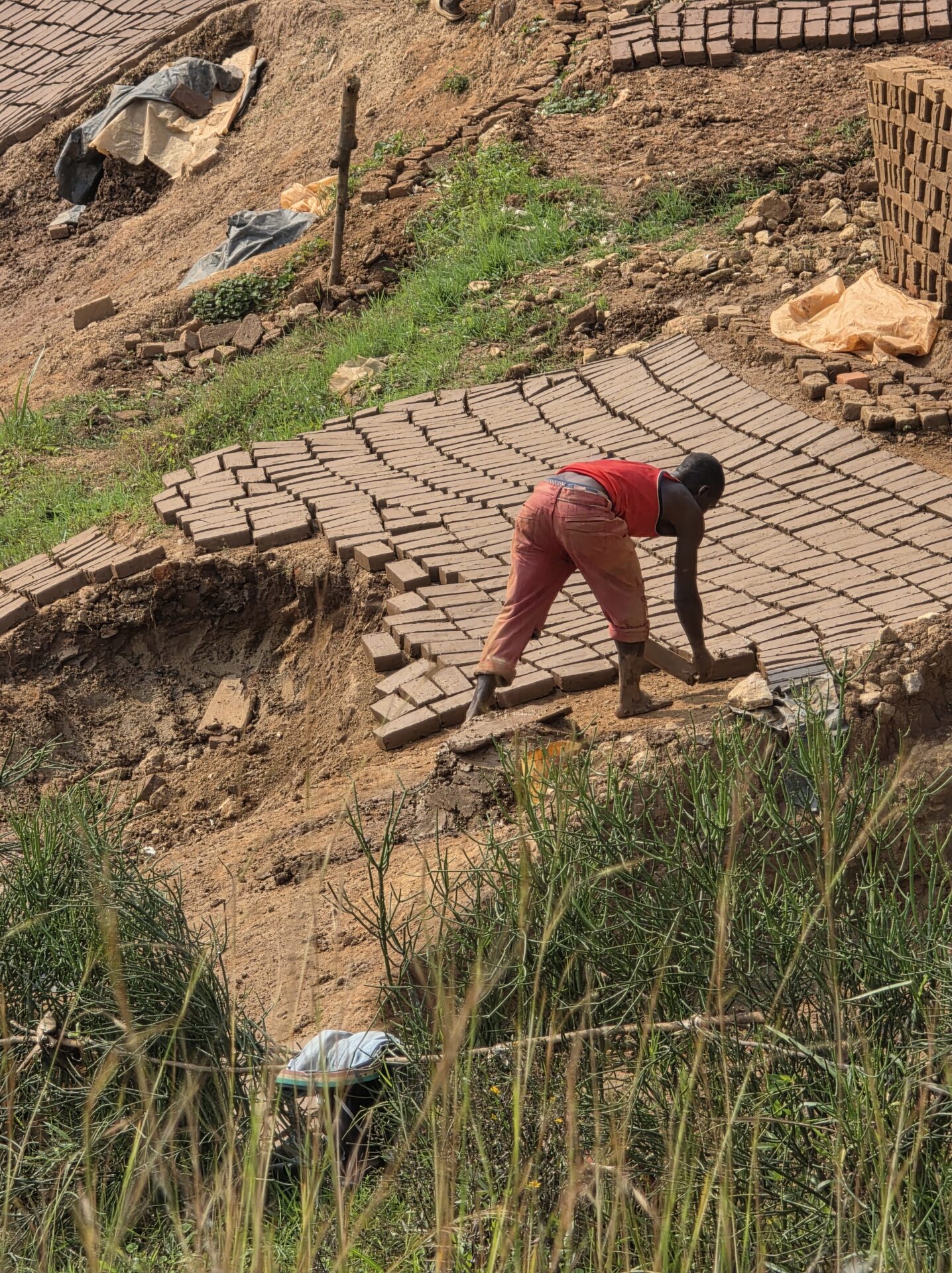 בוקר סגרירי- שוב- השמש יוצאת מהעננים מאוחר יותר, ומזג האויר תמיד נהדר לרכיבה וטיול. חשבנו להמשיך מכאן למקום של רון וייס על שפת אגם בוגסרה. המקום נראה מקסים בתמונות, אמנם דרך עפר של כמה קילומטרים, קטן עלינו… הזדמנות לנוח יומיים במקום שלו. בדיקה נוספת- אין ווי פי. לא נעמוד בזה. מוותרים בצער. הרכיבה כרגיל נעימה- כבישים טובים, מזג אויר נהדר, והתנועה איטית כמו שאני אוהבת! בצד הדרך קולטים 'מפעל לבנים'. גדי עוצר לצלם, כמובן שמיד מיהו עולה בריצה. גדי שואל אם אפשר להתקרב ולהכנס. בטח! יורדים מהכביש לדרך קטנה שמובילה למקום, איך שאנחנו מחנים את האופנועים כבר יש עשרה ילדים מסביבנו. הלבוש שלהם מרופט, אבל לא נראים מסכנים. שלשה קטנים מתקרבים עם גלגל ומוט- משחק מקובל שאצלנו נעלם מהנוף. גדי מבקש רשות לנסות. כולנו מתגלגלים מצחוק לראות את הכשלונות שלו.. אנחנו נכנסים לראות את העבודה- קודם חופרים ערימת בוץ, אחר כך יש את אלו שמכינים את הבלוקים בתבנית ומסדרים ליבוש. משם עוברים למגדל ענק של בלוקים, מסודר כמו פירמידה קטומה. למטה יש פתחים שלתוכם דוחפים שברי גזעים ומבעירים. האש דולקת כמה ימים, ומשאירים עוד כמה ימים להתקררות. פועל יכול לעשות כ 400-600 לבנים ביום. השכר של פועל פשוט- 2500 פרנק רואנדי ליום. זה פחות משני דולר. ומי שיש לו עבודה שמח מאד- באזורים החקלאיים לא תמיד יש. למרות שקצב העבודה שלהם יכול להוציא מהדעת את מי שבא מתרבות מערבית, הם עובדים קשה מאד.