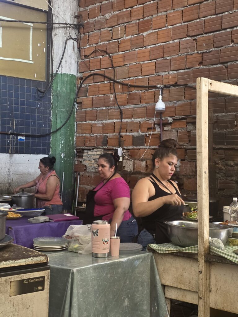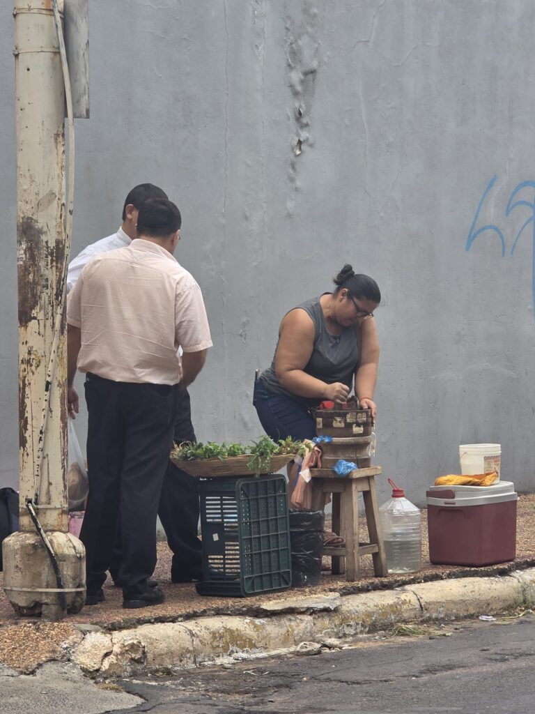 בחזרה למלון, בין בריכה לארוחה אנחנו בעיקר עובדים- יש תמיד פרויקטים שצריך להשלים ואם לא- נפתחים חדשים. בגלל הפרשי השעות עם הארץ יש לנו זמן לחשיבה ומחשב בשקט. בערב אנחנו יוצאים למסעדה מומלצת, נחשבת לטובה ביותר בעיר. המסעדה בנויה יפה, האוכל טוב, שרות טוב- ועדיין יש משהו קצת מוזר- לא הבנו עד הסוף… שישי בבוקר תוכנן לסיור בעיר עם גורו-ווק, אבל גשם שוטף מרתיע את הנרשמים. אין לנו חשק לצאת לבד עם המדריך- קובעים איתו למחר בבוקר עם קבוצה אחרת, ויוצאים להסתובב לבד. העיר לא מובנת בכלל. באותו רחוב יש בניין קולוניאלי, לידו מבנה ישן, מבנים מוזנחים או נטושים ובניין קומות מכוער. על המדרכות מוכרים שטויות ליד חלפנים ודוכני אוכל. בכל פינה עומד מישהו עם שולחן עשבים ולפי בקשת הקונה כותש חבילה קטנה. האישה החביבה בתמונה מסבירה לנו שאלו צמחי מרפא שמוסיפים ל terere- משקה מאטה קר ששותים פה הרבה. יש לכאבי ראש, כאבי בטן, עייפות- עוד לא ניסינו.